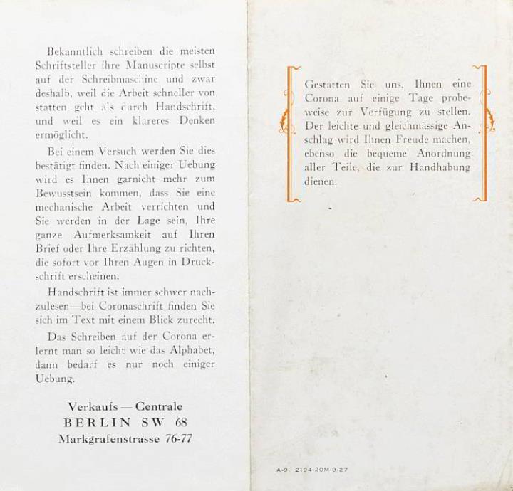 Faltprospekt für Schreibmaschine Corona Nr. A-9 2194-20M-9--27