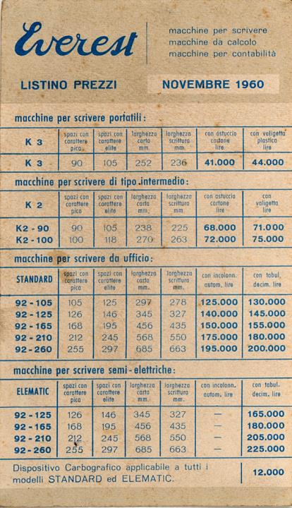 Preisliste für Schreib-, Rechen- und Buchungsmaschinen Everest Stand 11/1960