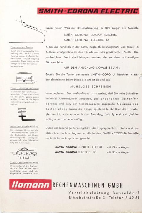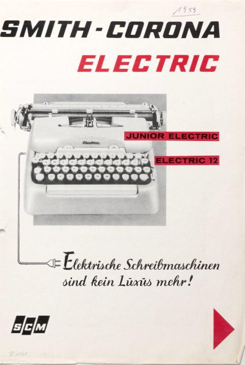Prospekt für Schreibmaschine Smith-Corona Junior Electric und Electric 12 Elektrische Schreibmaschinen sind kein Luxus mehr! Datum handschriftlich vermerkt