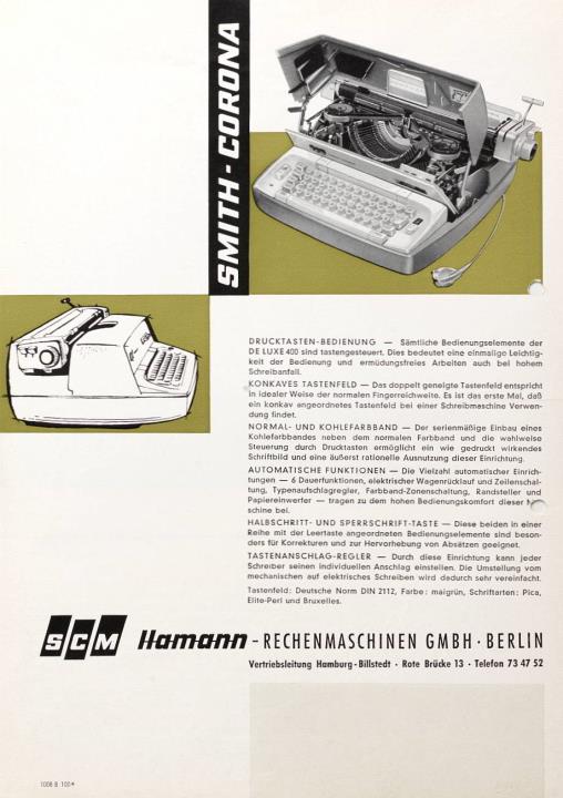 Prospekt für elektrische Schreibmaschine Smith-Corona de Luxe 400 mit Drucktasten-Automatic Nr. 1008 B 100 Datum handschriftlich vermerkt