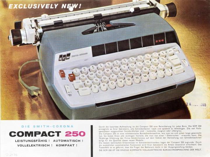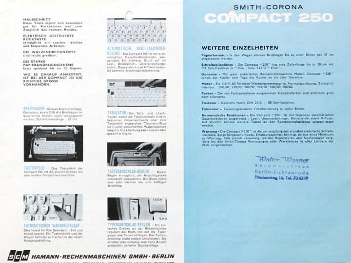 Prospekt für elektrische Schreibmaschine Smith-Corona Compact 250 mit Datumstempel