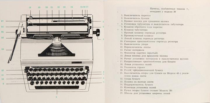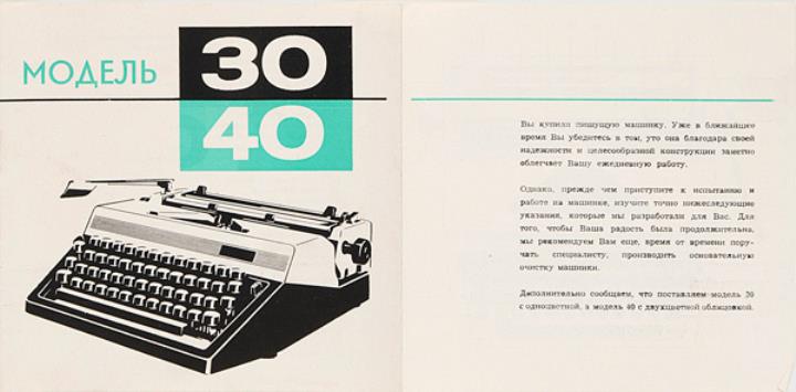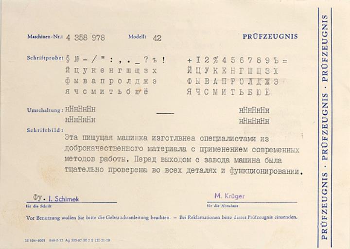 Bedienungsanleitung in russischer Sprache für Schreibmaschine Erika 30 und 40 Nr. III-9-4 lt 363/68 Beilage: Hinweisblatt, Anleitung für Modell 32/42 und Prüfzeugnis mit Schriftprobe für Maschine Nr. 4358978