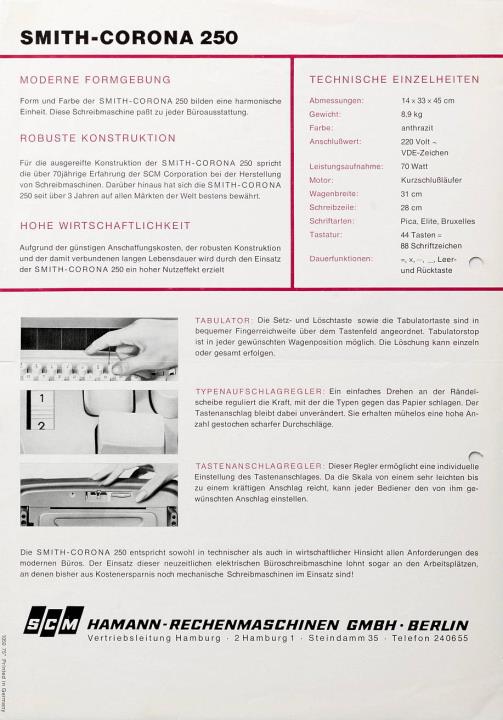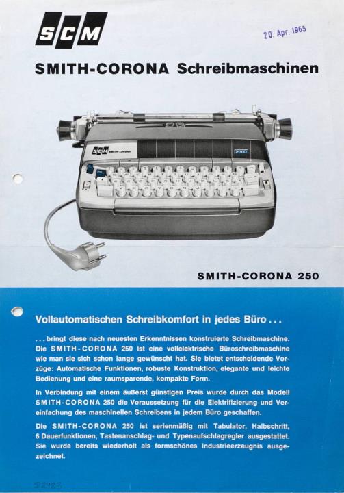 Prospekt für elektrische Schreibmaschine Smith-Corona 250 Nr. 1050 75 mit Datumstempel