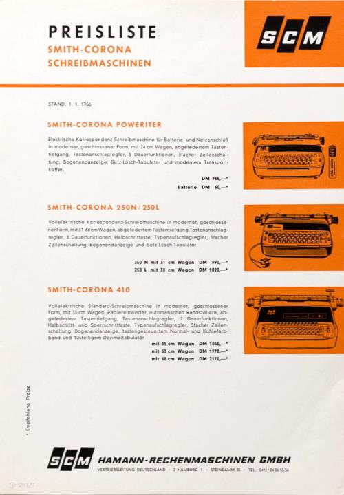 Preisliste für Schreibmaschine Smith-Corona Stand: 1.1.1966