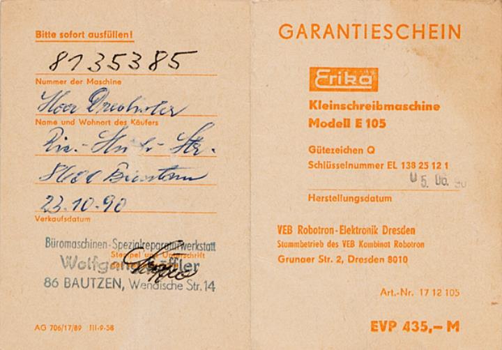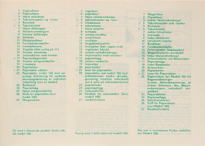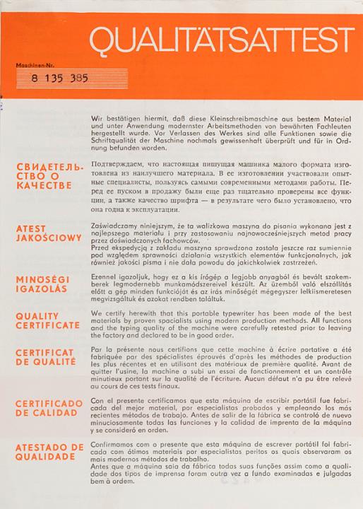 Bedienungsanleitung dreisprachig für Schreibmaschine Erika 100 und 105 Nr. III 9 142 AG 706 180 88 188 Beilagen: Qualitätsattest und Garantieschein für Maschine Nr. 8135385