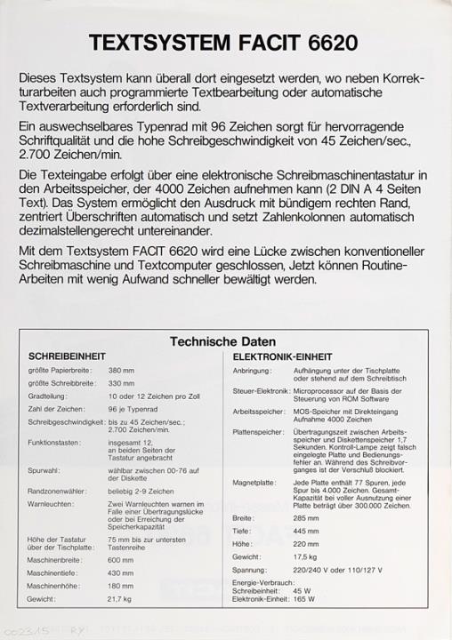 Prospekt für elektronische Schreibmaschine Facit 6620