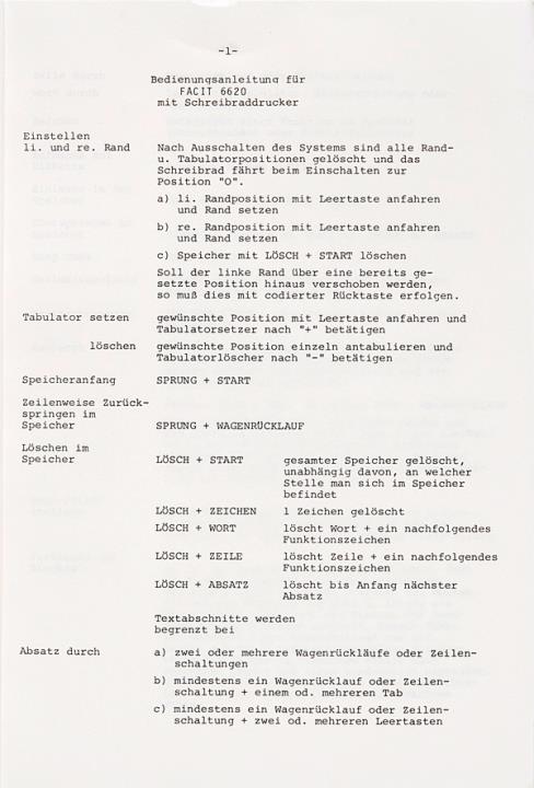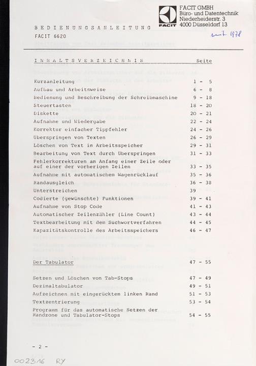 Bedienungsanleitung für elektronische Schreibmaschine Facit 6620 Datum handschriftlich vermerkt