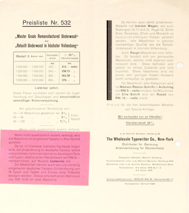 Faltprospekt mit Preisliste für Schreibmaschine Underwood Datum handschriftlich vermerkt