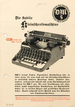 Prospekt für Schreibmaschine DM 5 Die Schreibmaschine des deutschen Mechanikers Nr. DM 62/BA3 Datum handschriftlich vermerkt