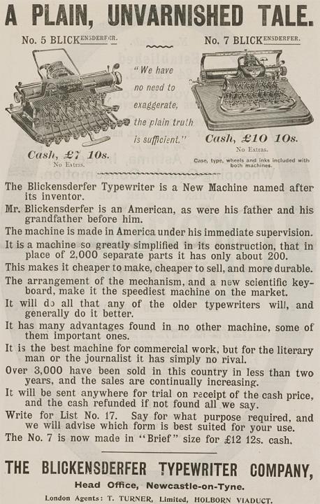 Werbeanzeige für Schreibmaschine Blickensderfer 5 und 7 monochrom