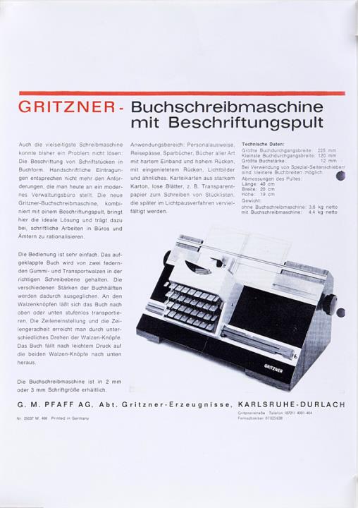 Prospekt für Buchschreibmaschine Gritzner Nr. 25037 W.466; Fotokopie