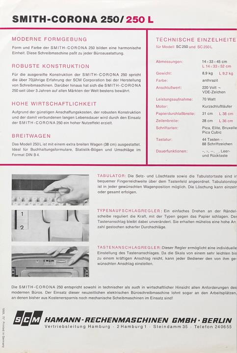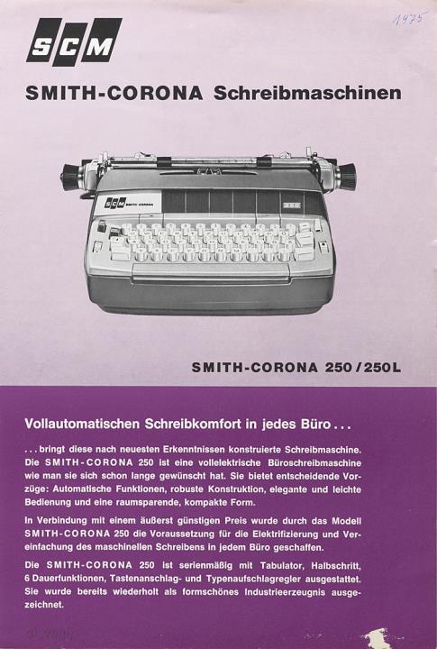 Prospekt für elektrische Schreibmaschine Smith-Corona 250/250 L Vollautomatischen Schreibkomfort in jedes Büro... Nr. 1050L 75 Datum handschriftlich vermerkt