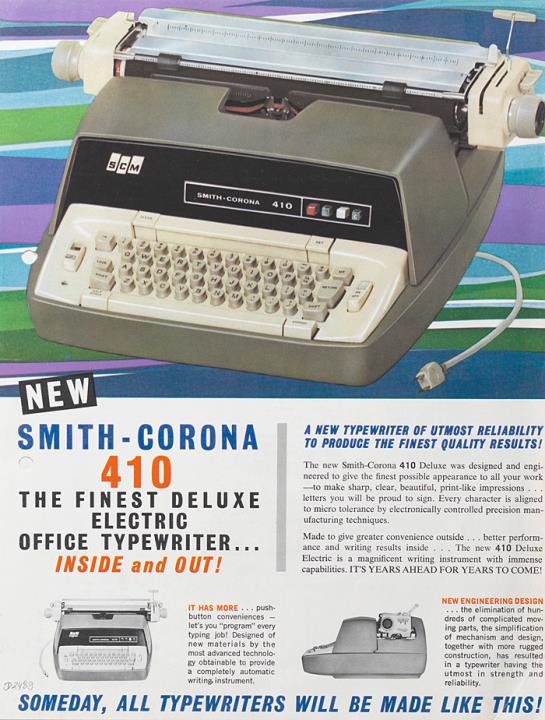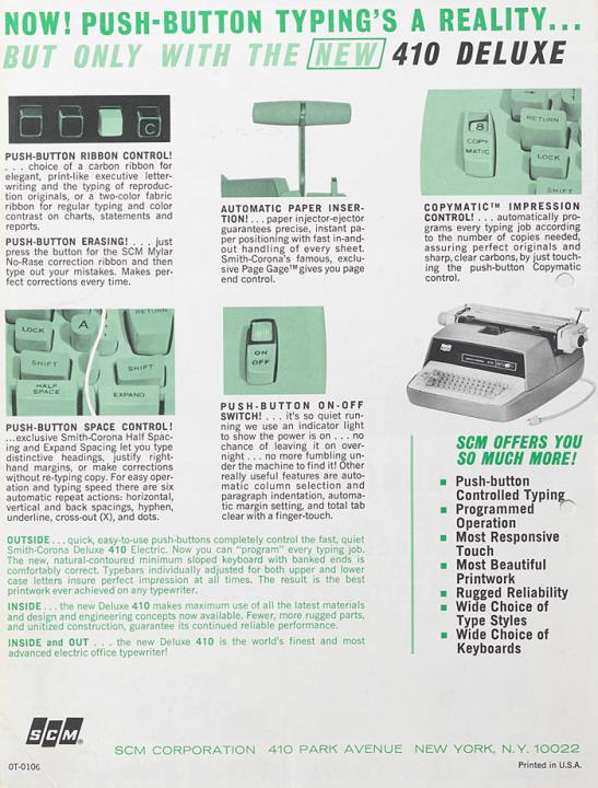 Prospekt für elektrische Schreibmaschine Smith-Corona 410 The finest Deluxe Electric Office Typewriter...Inside and Out! Nr. OT 0106