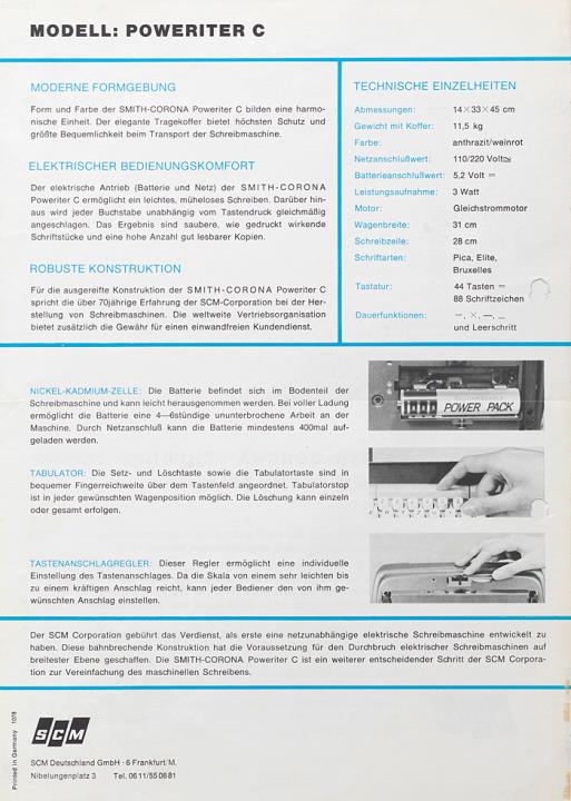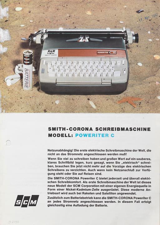 Prospekt für batteriebetriebene Schreibmaschine Smith-Corona Poweriter C Nr. 1078 mit Datumstempel
