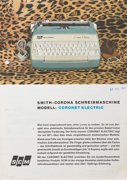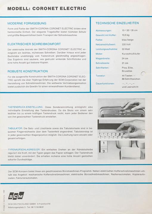 Prospekt für elektrische Schreibmaschine Smith-Corona Coronet Electric Nr. 1080 mit Datumstempel