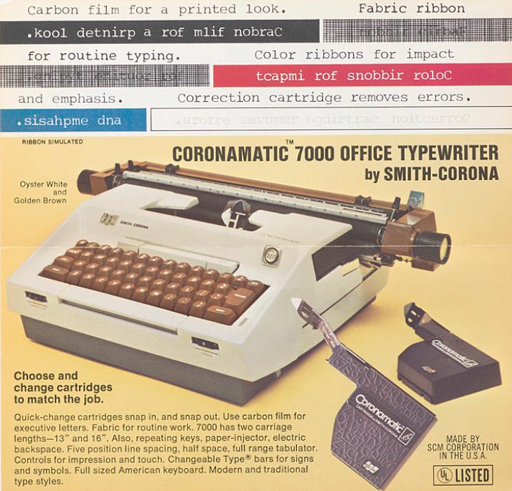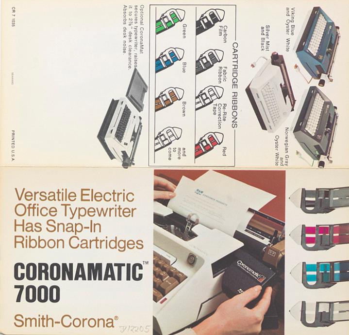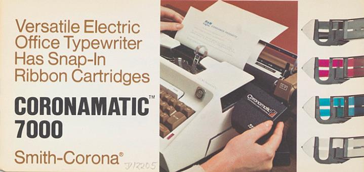 Faltprospekt für elektrische Schreibmaschine Smith-Corona Coronamatic 7000 Versatile Electric Office Typewriter has Snap-In Ribbon Cartridges Nr. CR 7 1035
