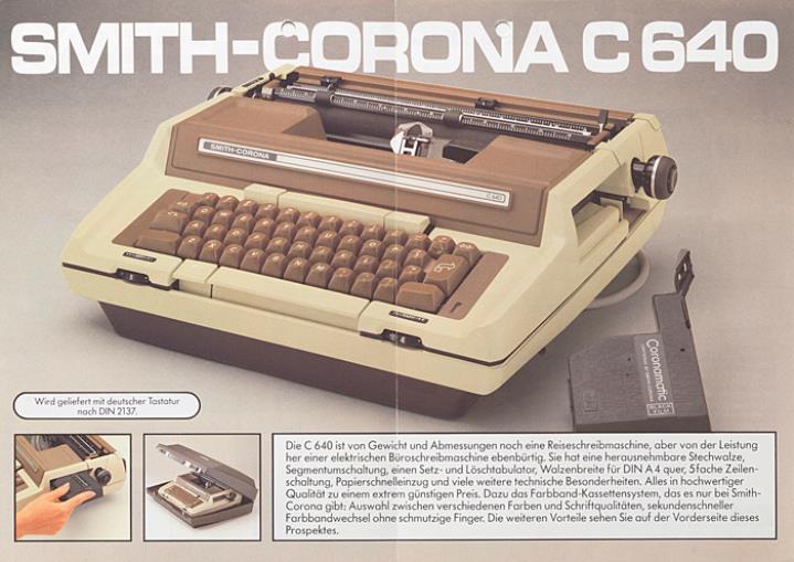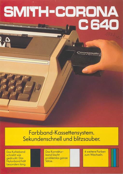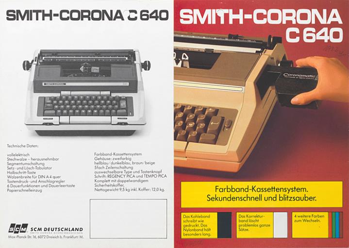 Faltprospekt für elektrische Schreibmaschine Smith-Corona C640 mit Farbband-Kassettensystem. Sekundenschnell und blitzsauber. Datum handschriftlich vermerkt