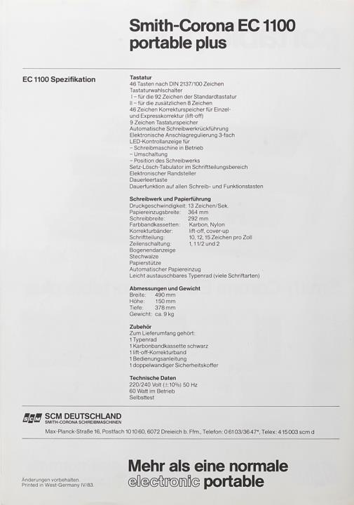 Prospekt für Schreibmaschine Smith-Corona EC 1100 portable plus Mehr als eine normale electronic portable