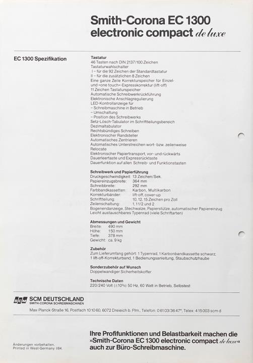 Prospekt für Schreibmaschine Smith-Corona EC 1300 electronic compact de luxe Datum handschriftlich vermerkt