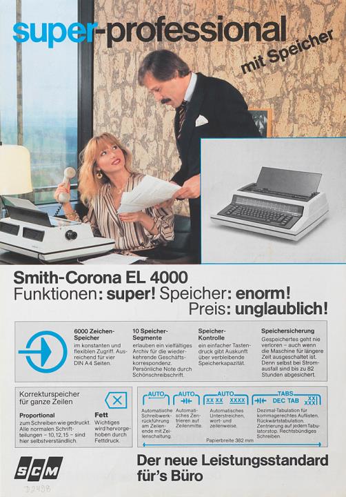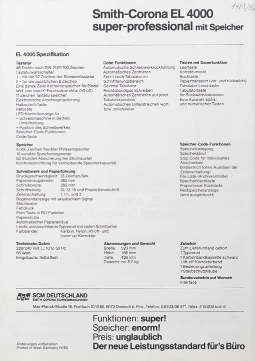Prospekt für elektrische Schreibmaschine Smith-Corona EL 4000 super-professional mit Speicher Datum handschriftlich vermerkt