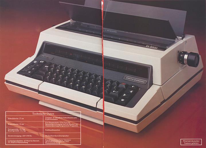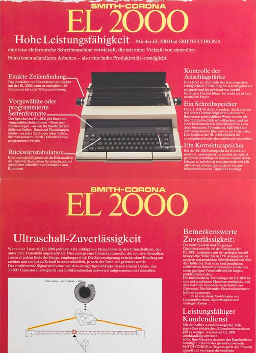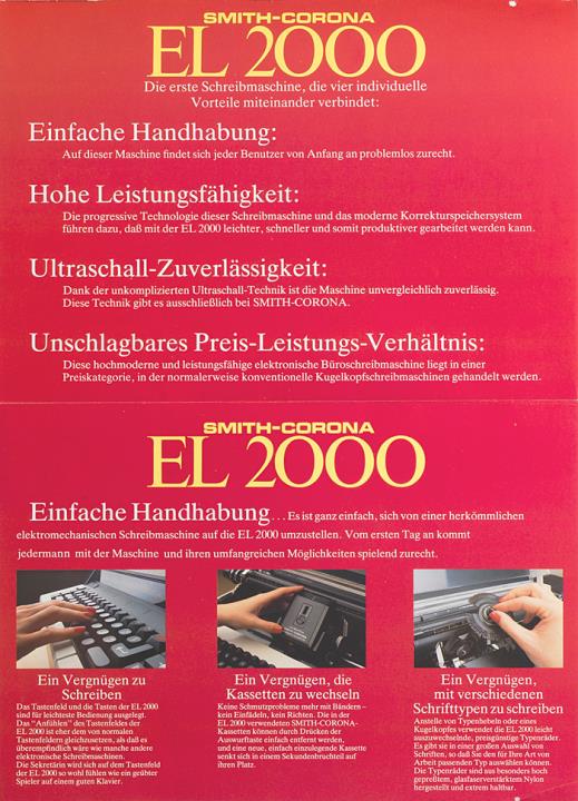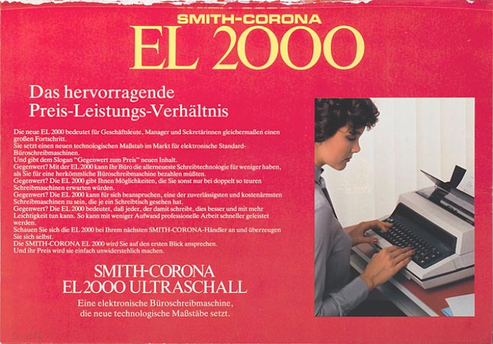 Faltprospekt für elektronische Schreibmaschine Smith-Corona EL 2000 Eine elektronische Büroschreibmaschine, die neue technologische Maßstäbe setzt