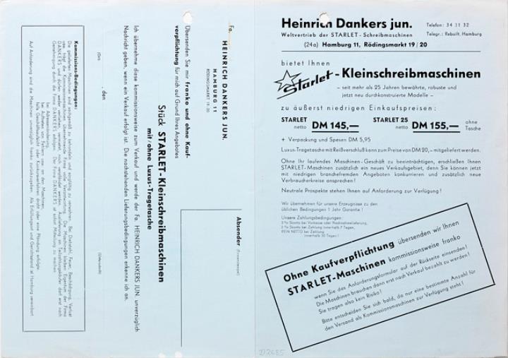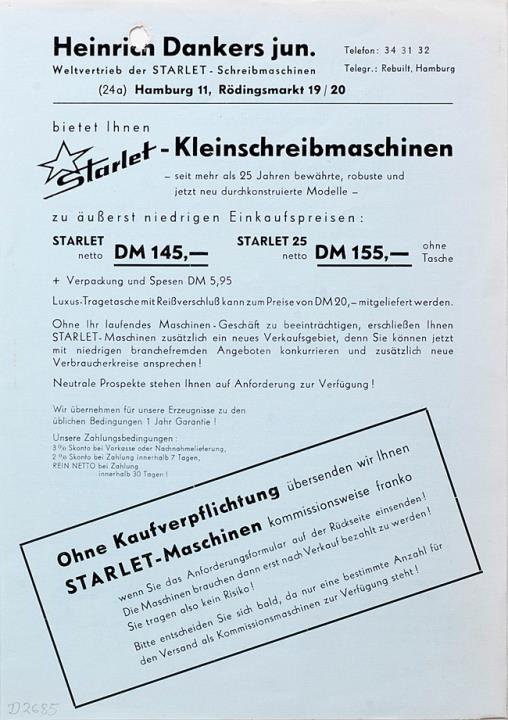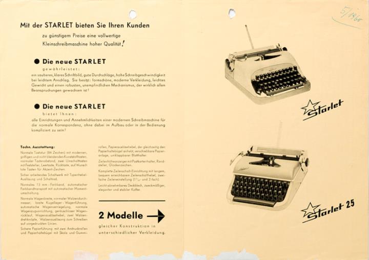 Faltprospekt für Schreibmaschine Starlet Datum handschriftlich vermerkt