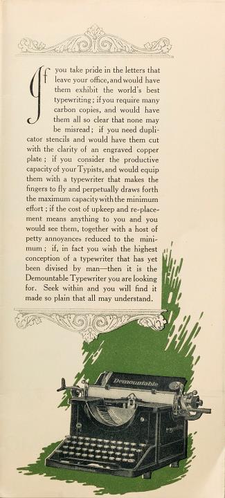 Next to literature on the history of technology, of the typewriter and the office, the Archive holds patent letters, textbooks and instruction manuals as well as historical postcards, letters, photographs and various kinds of advertising (leaflets and brochures, advertising stamps, newspaper ads, posters and signs, promotional gifts).
