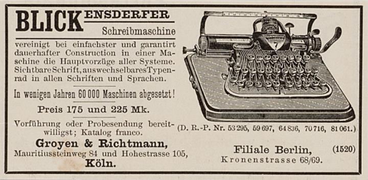 Werbeanzeige für Schreibmaschine Blickensderfer monochrom