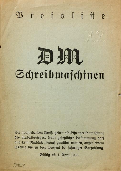 Preisliste für Schreibmaschine DM gültig ab 1. April 1936 Die Schreibmaschine des deutschen Mechanikers Nr. DM 18/BA 7