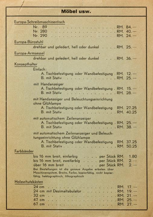 Schreibmaschine, Typenhebel, Preise, Preisliste