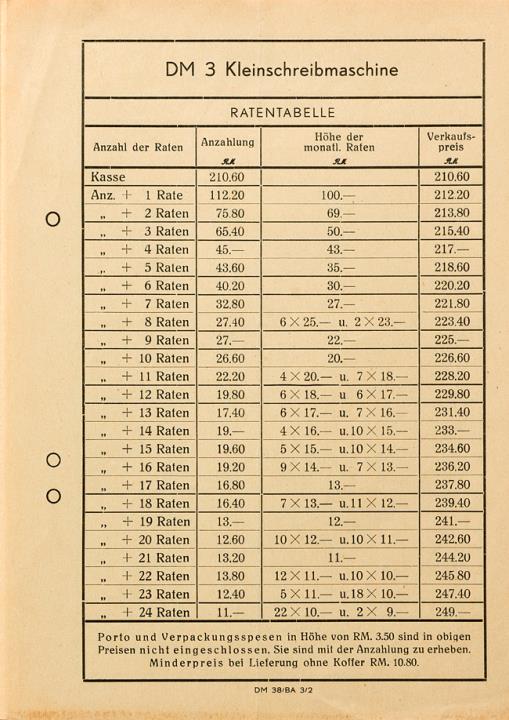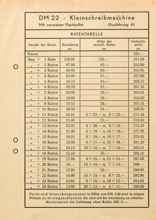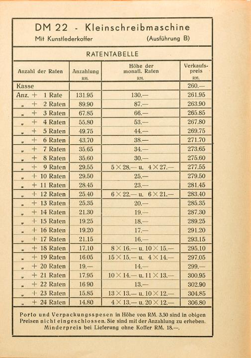 Preisliste und Ratentabelle für Schreibmaschine DM; gültig ab 25. Februar 1939 Die Schreibmaschine des deutschen Mechanikers Nr. DM 18/BA 31/1