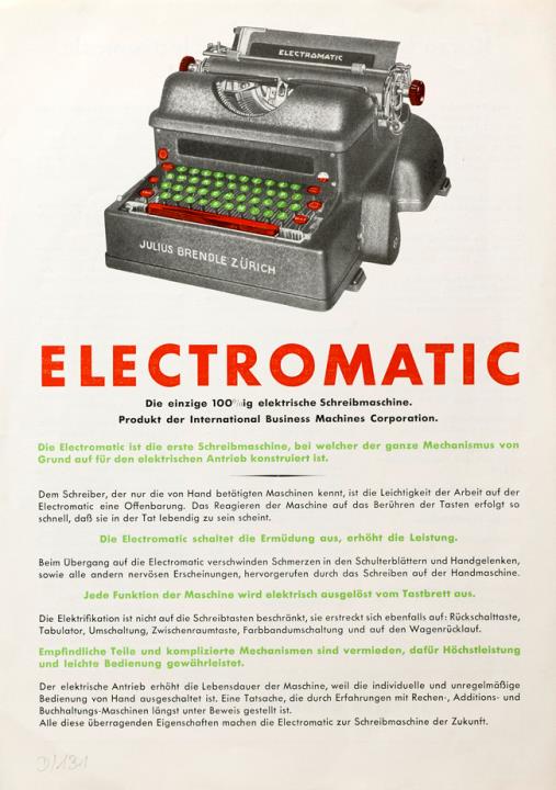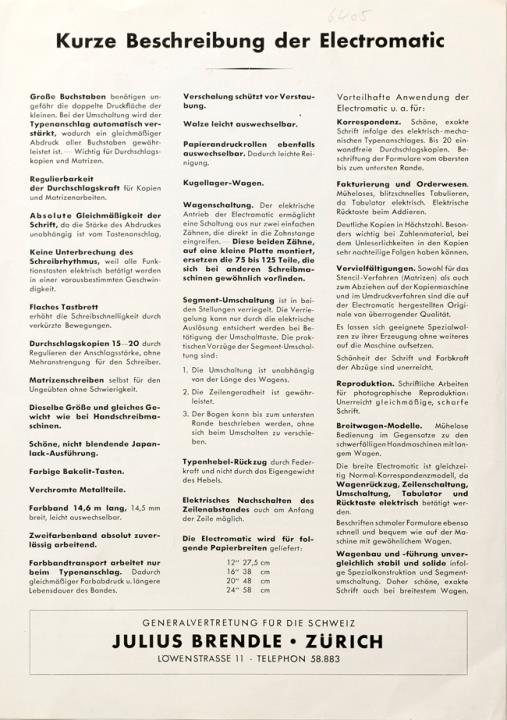 Prospekt für elektrische Schreibmaschine Electromatic Die einzige 100%ig elektrische Schreibmaschine