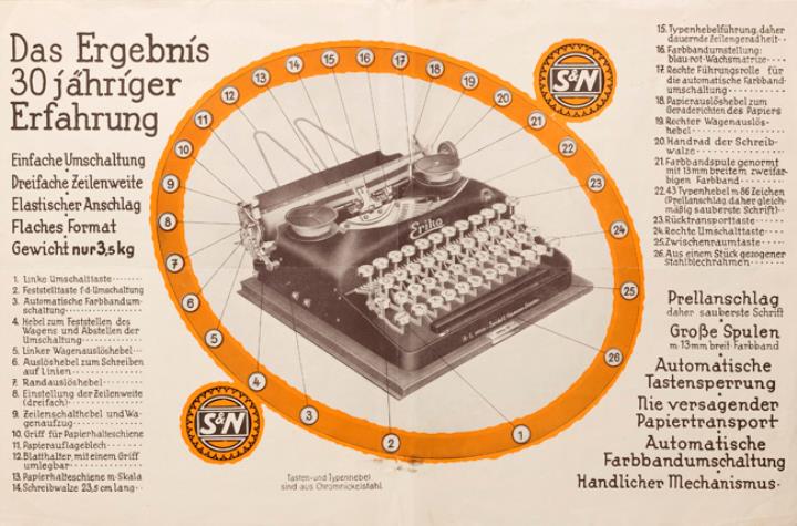 Next to literature on the history of technology, of the typewriter and the office, the Archive holds patent letters, textbooks and instruction manuals as well as historical postcards, letters, photographs and various kinds of advertising (leaflets and brochures, advertising stamps, newspaper ads, posters and signs, promotional gifts).