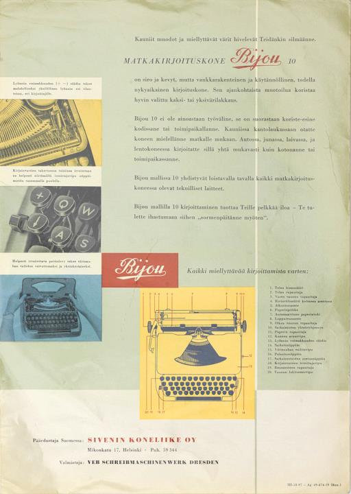 Prospekt in finnischer Sprache für Schreibmaschine (Erika) Bijou 10 Nr. III-18-97