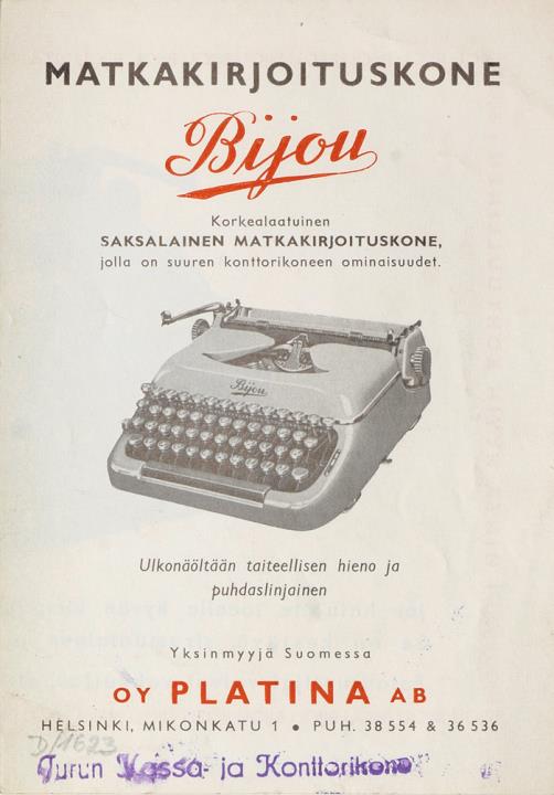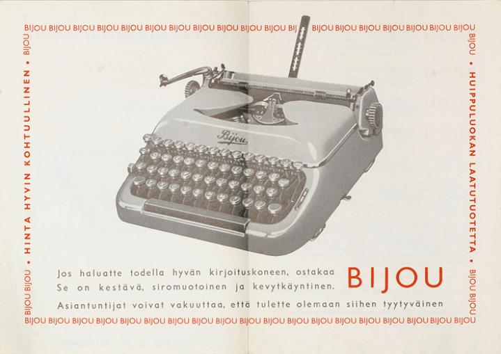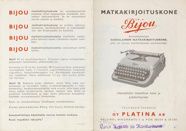 Faltprospekt in finnischer Sprache für Schreibmaschine (Erika) Bijou