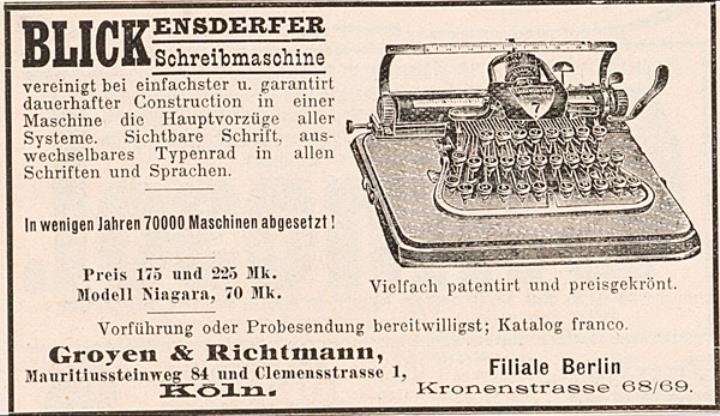 Werbeanzeige für Schreibmaschine Blickensderfer monochrom