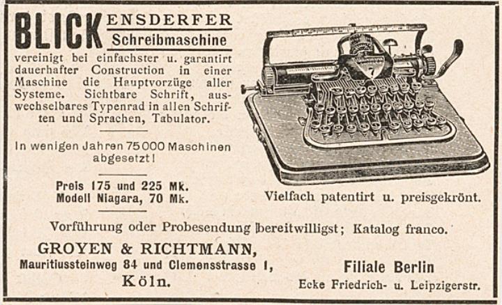 Werbeanzeige für Schreibmaschine Blickensderfer monochrom