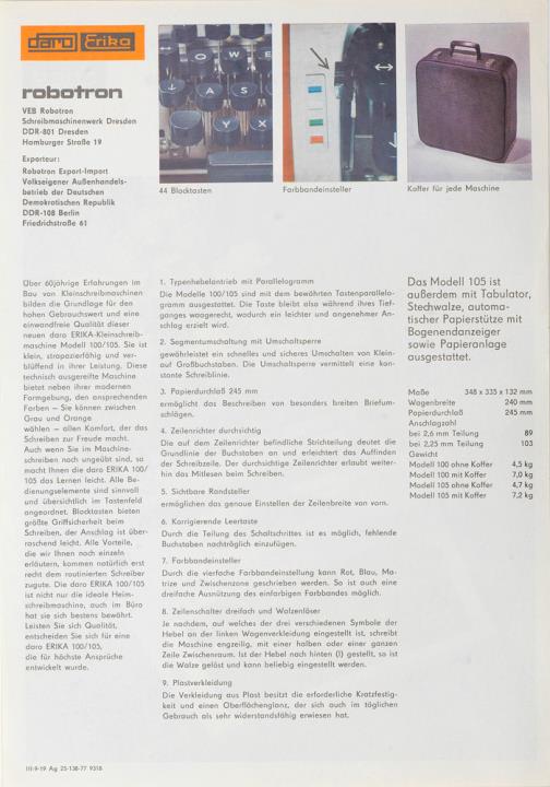 Prospekt für Schreibmaschine daro Erika 100, 105 Nr. III-9-19 Ag 25-138-77 9318