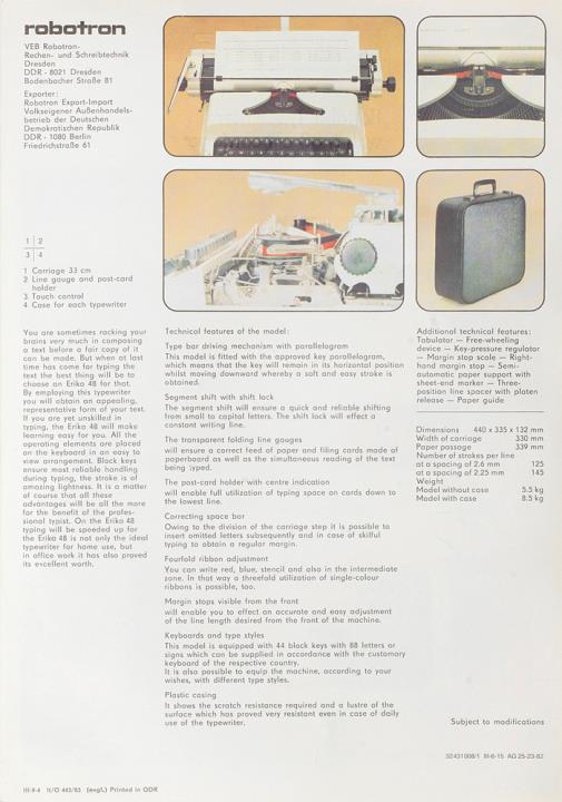 Prospekt für Schreibmaschine Erika 48 mit Breitwagen Portable typewriter with a 33 cm carriage Nr. III-9-4 It/G 443/83 (engl.)