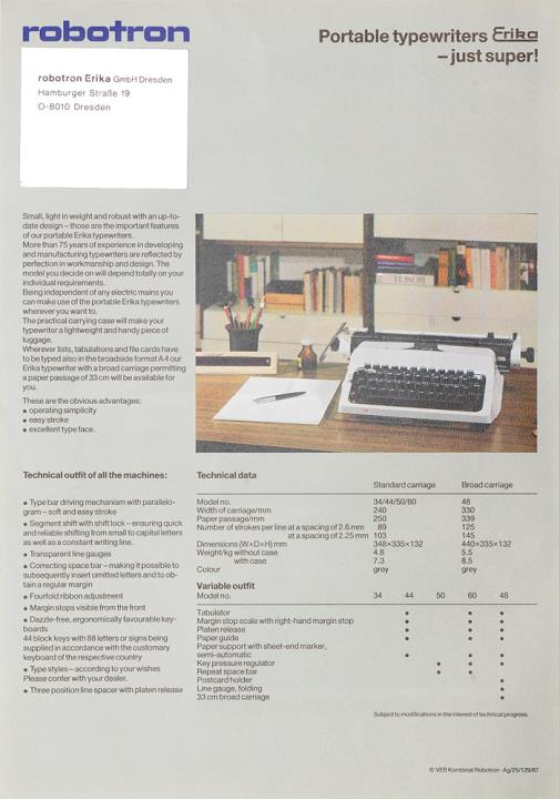 Prospekt für Schreibmaschine Erika Nr. Ag/25/129/87