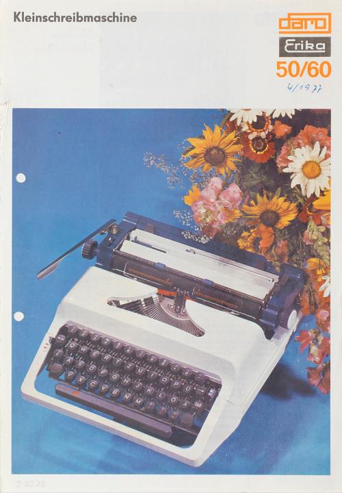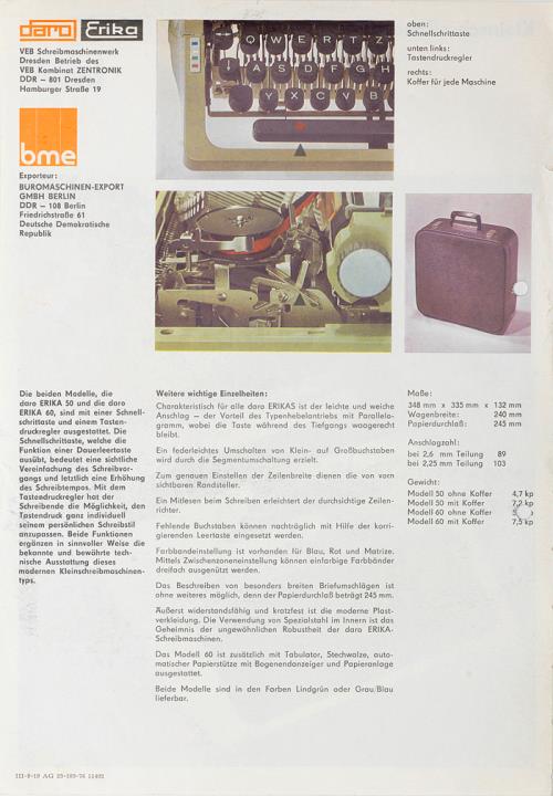 Prospekt für Schreibmaschine daro Erika 50, 60 Nr. III-9-19 AG 25-109-76 Datum handschriftlich vermerkt