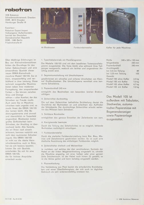 Prospekt für Schreibmaschine Erika 100, 105 Nr. III-17-20 Ag 25/43/80
