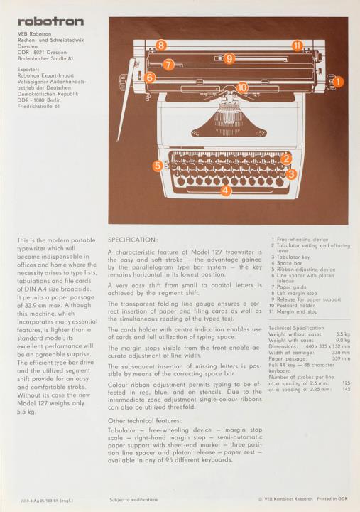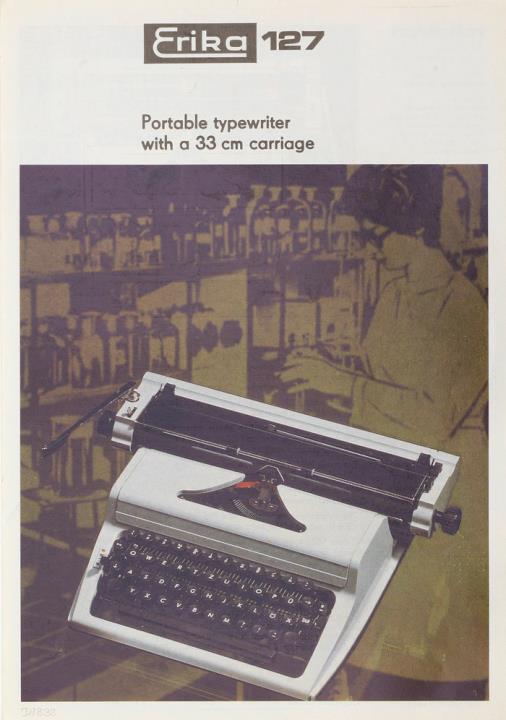 Prospekt für Schreibmaschine Erika 127 Portable typewriter with a 33 cm carriage Nr. III-9-4 Ag 25/103/81 (engl.)