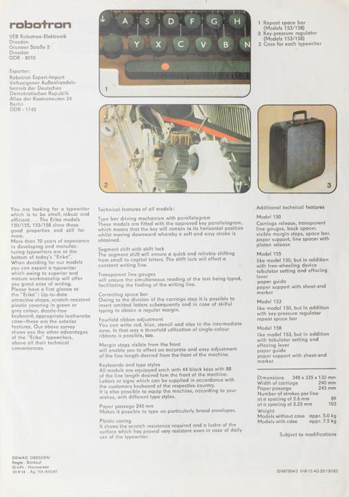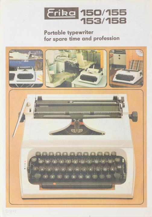 Prospekt für Schreibmaschine Erika 150, 155, 153 und 158 Portable typewriter for spare time and profession Nr. III/9/14. Ag 706/450/87