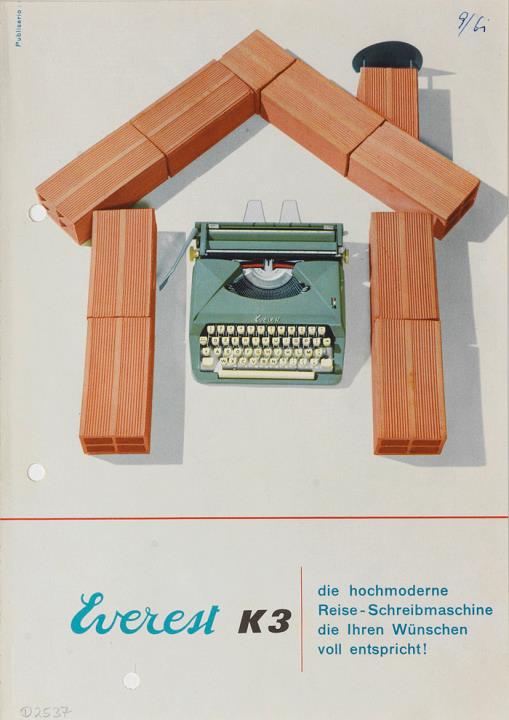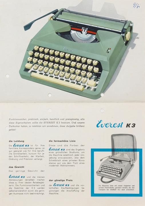 Faltprospekt für Schreibmaschine Everest K3 die hochmoderne Reise-Schreibmaschine die Ihren Wünschen voll entspricht! Nr. E 329 Datum handschriftlich vermerkt