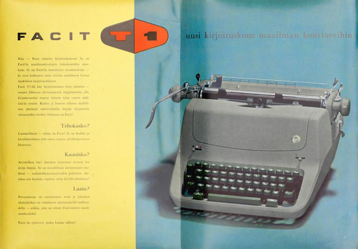 Faltprospekt in finnischer Sprache für Schreibmaschine Facit T1 Nr. 41.02.02.FI.3.M.11.57