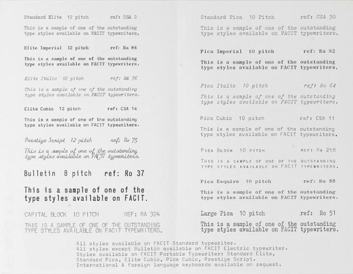 Schriftartenverzeichnis für Schreibmaschine Facit Nr. 41-10M-7/64