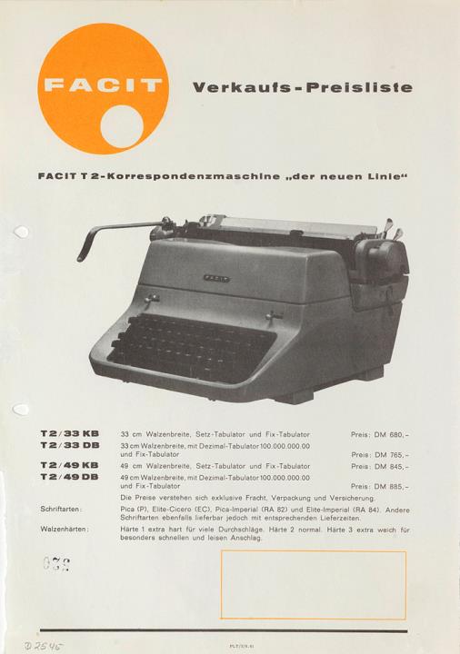 Preisliste für Schreibmaschine Facit T2 Korrespondenzmaschine "der neuen Linie" Nr. PLT3/6.61