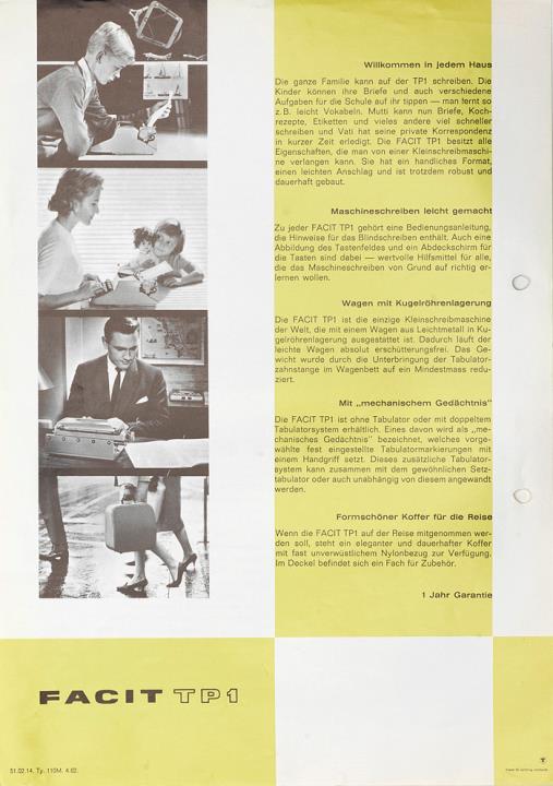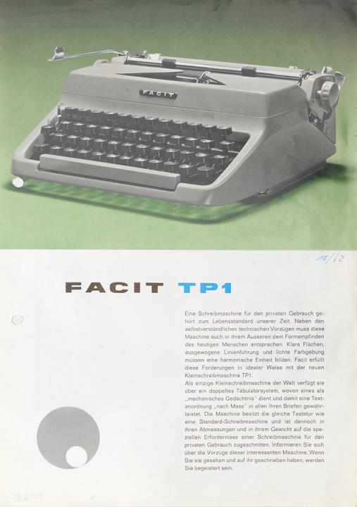 Prospekt für Schreibmaschine Facit TP1 Nr. 51.02.14.Ty.110.M.4.62. Datum handschriftlich vermerkt