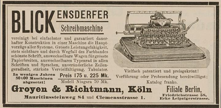 Werbeanzeige für Schreibmaschine Blickensderfer monochrom